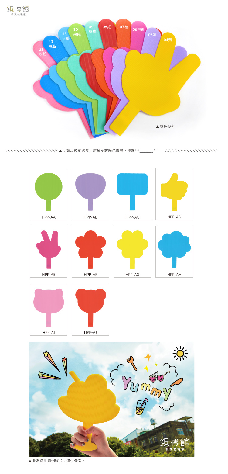 ●可當扇子、拍照小道具、演唱會加油牌..等。 ●尺寸:高約27cm 寬約18cm 厚度約3mm ●材質:PP板,外觀上呈中空狀 ●PP瓦楞板特色: 1. 材質輕盈、易裁切。 2. 防潮性佳、可直接水洗、可回收。 ●注意: 8歲以下幼童須由家長陪同使用 ●保存期限:10年 ●此商品不挑色,介意者請勿下標,謝謝!! ※商品會因電腦顏色有所差異,以現貨為準,介意色差者請勿下標 ※若有顏色款式問題,或需大量訂購,歡迎來電諮詢