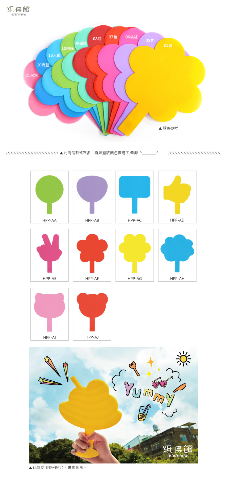 ●可當扇子、拍照小道具、演唱會加油牌..等。 ●尺寸:高約27cm 寬約22cm 厚度約3mm ●材質:PP板,外觀上呈中空狀 ●PP瓦楞板特色: 1. 材質輕盈、易裁切。 2. 防潮性佳、可直接水洗、可回收。 ●注意: 8歲以下幼童須由家長陪同使用 ●保存期限:10年 ●此商品不挑色,介意者請勿下標,謝謝!! ※商品會因電腦顏色有所差異,以現貨為準,介意色差者請勿下標 ※若有顏色款式問題,或需大量訂購,歡迎來電諮詢