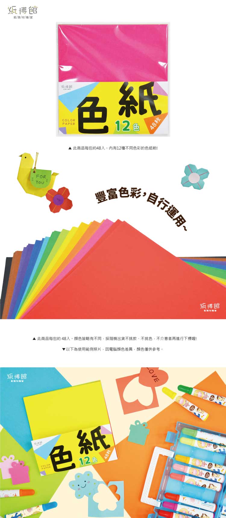 ●適合用於折紙、勞作、卡片、裝飾時使用。 ●尺寸:15x15cm/張 ●1包48張入,顏色皆略有不同,採隨機出貨方式,如不介意者再進行下標,謝謝! ●材質:紙張 ●保存期限:10年 ※商品會因電腦顏色有所差異,以現貨為準,介意色差者請勿下標 ※若有顏色款式問題,或需大量訂購,歡迎來電諮詢