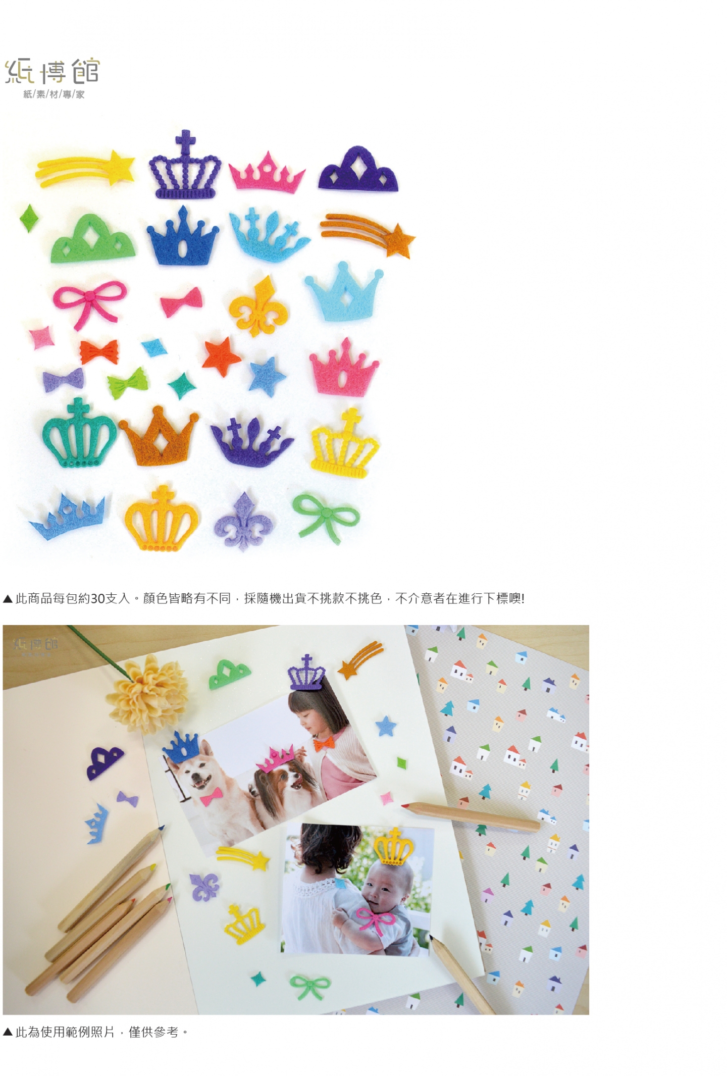 ●適合用於卡片、佈置、裝飾時使用。 ●材質:不織布 ●多種造型(皇冠、蝴蝶結、星星),約30入,隨機顏色 ●保存期限:10年 ※商品會因電腦顏色有所差異,以現貨為準 ※若有顏色款式問題,或需大量訂購,歡迎來電諮詢