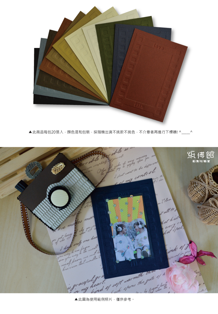 ●適合用於卡片、佈置、裝飾時使用。 ●高級質感紙張加工,亦可當明信片使用。 ●尺寸:A6,105X148.5mm ●材質:紙張加工,209P ●最低購買量為一包(20張入),每張5元,顏色隨機包裝,不挑色,如無法接受,請勿下單,謝謝! ●保存期限:10年 ※商品會因電腦顏色有所差異,以現貨為準,介意色差者請勿下標 ※若有顏色款式問題,或需大量訂購,歡迎來電諮詢