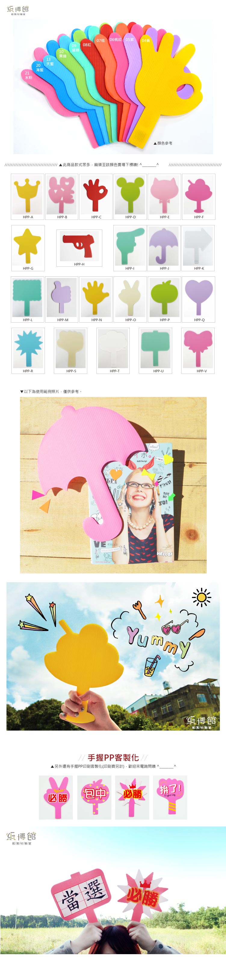 ●可當扇子、拍照小道具、演唱會加油牌..等。 ●尺寸:高約25cm 寬約20cm 厚度約3mm ●材質:PP板,外觀上呈中空狀 ●PP瓦楞板特色: 1. 材質輕盈、易裁切。 2. 防潮性佳、可直接水洗、可回收。 ●注意: 8歲以下幼童須由家長陪同使用 ●保存期限:10年 ●此商品不挑色,介意者請勿下標,謝謝!! ※商品會因電腦顏色有所差異,以現貨為準,介意色差者請勿下標 ※若有顏色款式問題,或需大量訂購,歡迎來電諮詢