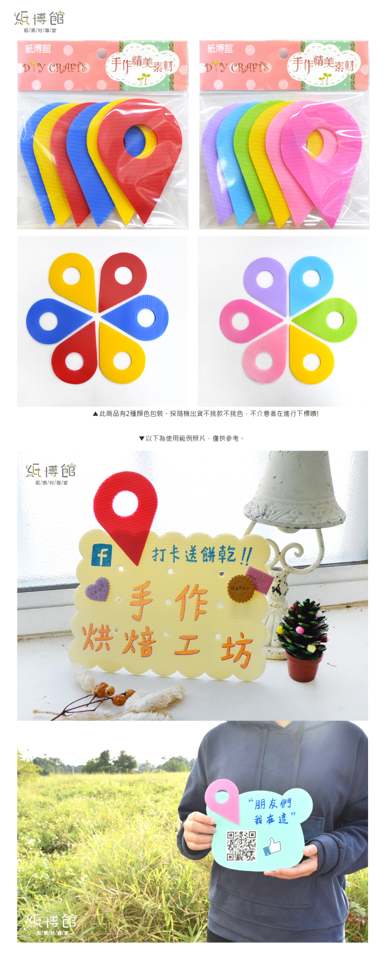 ●適用於店家 / 活動 /社群 ..等佈置、裝飾時使用。 ●尺寸:約10.2x6.9cm ●1包6片入,隨機出貨,不挑色 ●材質:PP板,外觀上呈中空狀 ●PP瓦楞板特色: 1. 材質輕盈、易裁切。 2. 防潮性佳、可直接水洗、可回收。 ●注意: 本商品含有小配件,8歲以下幼童須由家長陪同使用 ●保存期限:10年 ※商品會因電腦顏色有所差異,以現貨為準,介意色差者請勿下標 ※若有顏色款式問題,或需大量訂購,歡迎來電諮詢