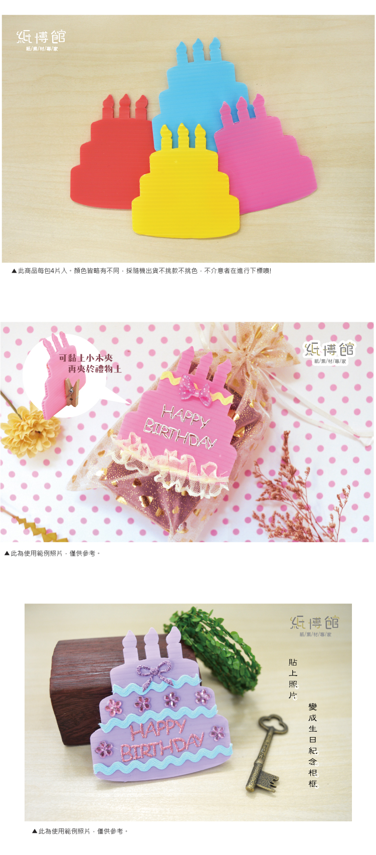 ●適合用於卡片、佈置、裝飾時使用。 ●尺寸:約長:9cm 寬:8.2cm 厚度約3mm ●1包4片入,隨機出貨,不挑色 ●材質:PP板,外觀上呈中空狀 ●PP瓦楞板特色: 1. 材質輕盈、易裁切。 2. 防潮性佳、可直接水洗、可回收。 ●注意: 本商品含有小配件,8歲以下幼童須由家長陪同使用 ●保存期限:10年 ※商品會因電腦顏色有所差異,以現貨為準,介意色差者請勿下標 ※若有顏色款式問題,或需大量訂購,歡迎來電諮詢