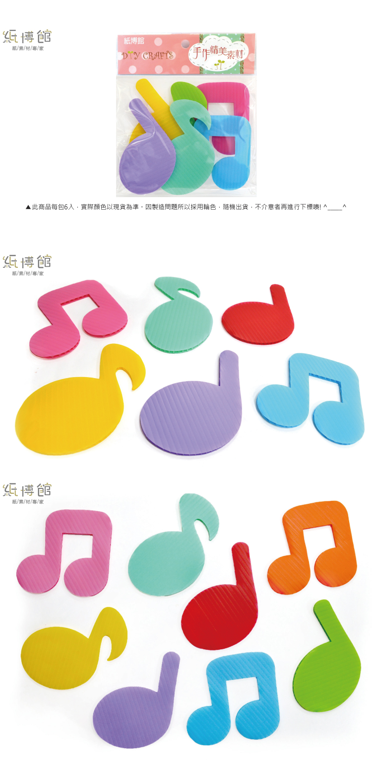 ●適合用於卡片、佈置、裝飾時使用。 ●尺寸:音符約8x7cm ●1包6片入,採隨機出貨,不挑色,不能接受者請勿下單,謝謝! ●材質:PP板,外觀上呈中空狀 ●PP瓦楞板特色: 1. 材質輕盈、易裁切。 2. 防潮性佳、可直接水洗、可回收。 ●注意: 本商品含有小配件,8歲以下幼童須由家長陪同使用 ●保存期限:10年 ※商品會因電腦顏色有所差異,以現貨為準,介意色差者請勿下標 ※若有顏色款式問題,或需大量訂購,歡迎來電諮詢