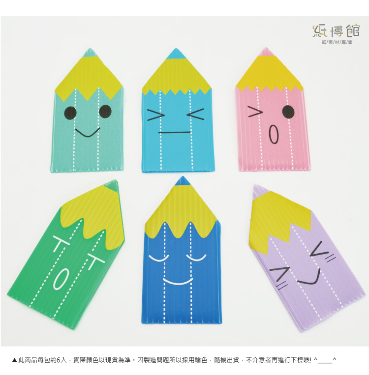 ●適合用於卡片、佈置、裝飾時使用。 ●尺寸:高約10cm 寬約5cm 厚度約3mm ●內含不同印刷圖案鉛筆,約6片入,隨機出貨,不挑款不挑色 ●材質:PP板 ●PP瓦楞板特色: 1. 材質輕盈、易裁切。 2. 防潮性佳、可直接水洗、可回收。 ●注意: 本商品含有小配件,8歲以下幼童須由家長陪同使用 ●保存期限:10年 ※商品會因電腦顏色有所差異,以現貨為準,介意色差者請勿下標 ※若有顏色款式問題,或需大量訂購,歡迎來電諮詢