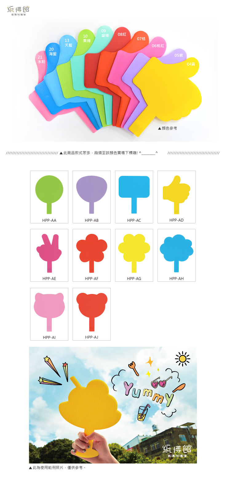 ●可當扇子、拍照小道具、演唱會加油牌..等。 ●尺寸:高約27cm 寬約19.5cm 厚度約3mm ●材質:PP板,外觀上呈中空狀 ●PP瓦楞板特色: 1. 材質輕盈、易裁切。 2. 防潮性佳、可直接水洗、可回收。 ●注意: 8歲以下幼童須由家長陪同使用 ●保存期限:10年 ●此商品不挑色,介意者請勿下標,謝謝!! ※商品會因電腦顏色有所差異,以現貨為準,介意色差者請勿下標 ※若有顏色款式問題,或需大量訂購,歡迎來電諮詢