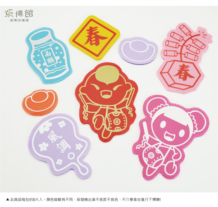 ●適合用於卡片、佈置、裝飾時使用。 ●內含不同印刷圖案的招財寶寶、元寶、鞭炮、祝賀語……等,約8片入,厚度3mm,隨機出貨,不挑款不挑色 ●材質:PP板 ●PP瓦楞板特色: 1. 材質輕盈、易裁切。 2. 防潮性佳、可直接水洗、可回收。 ●注意: 本商品含有小配件,8歲以下幼童須由家長陪同使用 ●保存期限:10年 ※商品會因電腦顏色有所差異,以現貨為準,介意色差者請勿下標 ※若有顏色款式問題,或需大量訂購,歡迎來電諮詢
