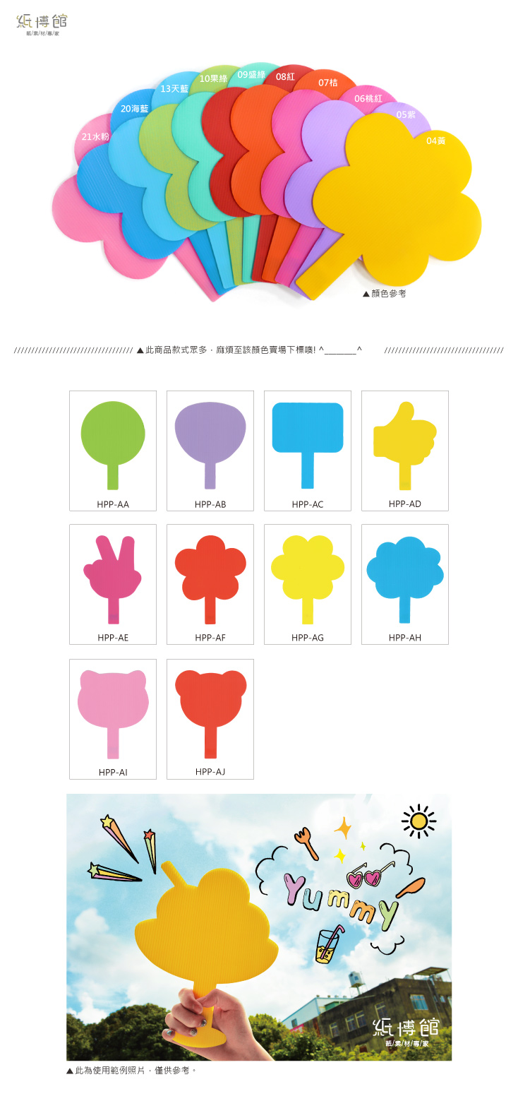●可當扇子、拍照小道具、演唱會加油牌..等。 ●尺寸:高約27cm 寬約22cm 厚度約3mm ●材質:PP板,外觀上呈中空狀 ●PP瓦楞板特色: 1. 材質輕盈、易裁切。 2. 防潮性佳、可直接水洗、可回收。 ●注意: 8歲以下幼童須由家長陪同使用 ●保存期限:10年 ●此商品不挑色,介意者請勿下標,謝謝!! ※商品會因電腦顏色有所差異,以現貨為準,介意色差者請勿下標 ※若有顏色款式問題,或需大量訂購,歡迎來電諮詢