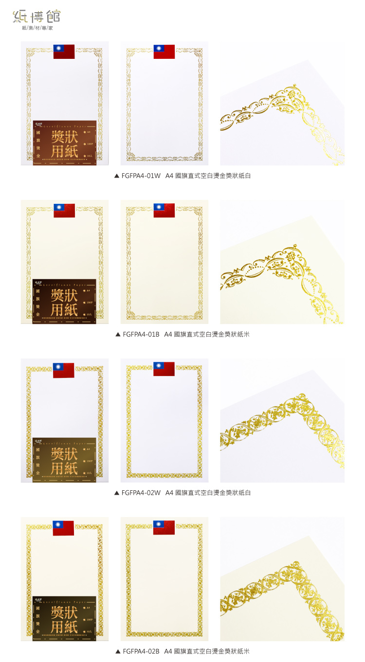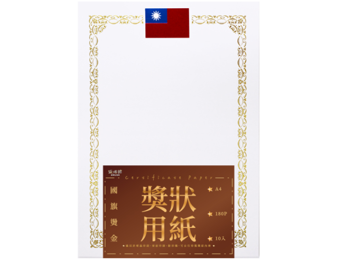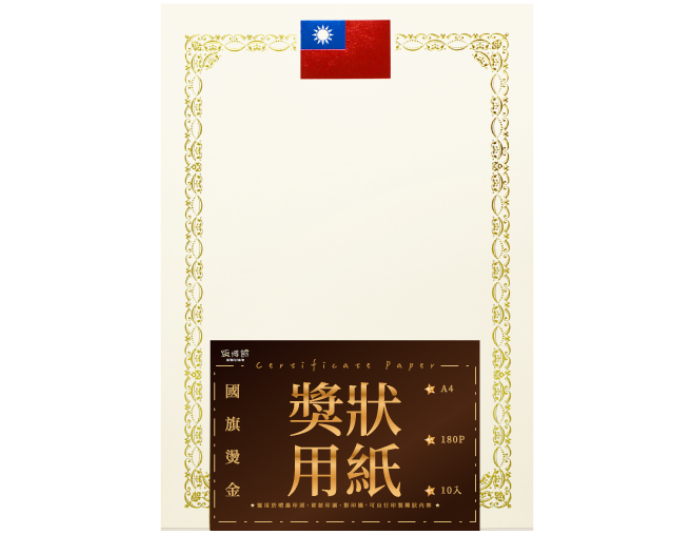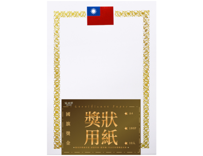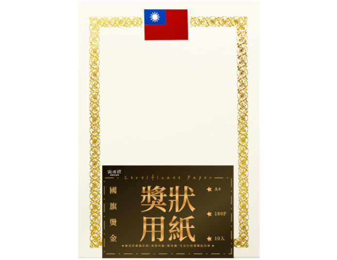 • A4 180g 國旗直式空白燙金獎狀紙(米/白)(10入)